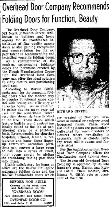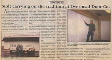 Overhead Door Company of Terre Haute was founded in 1929 as part of the W.J. Giffel Company. W.J. Giffel and son Marvin owned the business until 1977 when they sold to a couple of their employees, John Wiggins and DuWayne Ramsey. John and DuWayne co-owned the business until July 1996 when they sold to Jim Stolt. John retired when Jim started, but DuWayne stayed until August 1998. Jim and his son Brian own the business today. In July 2018 after 22 years, Jim retired and Brian and his team are now running the business.